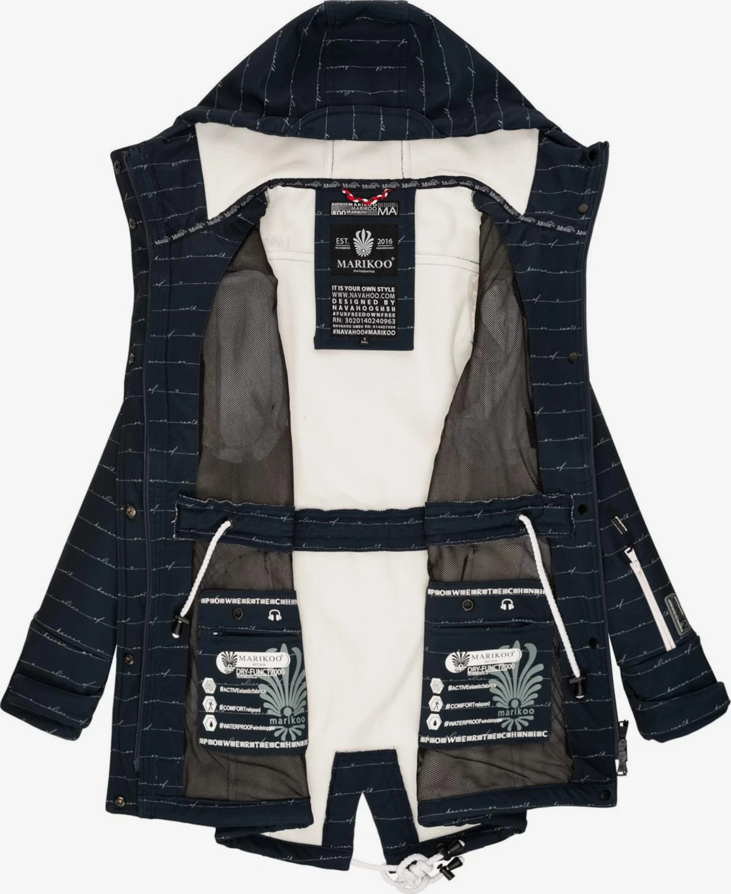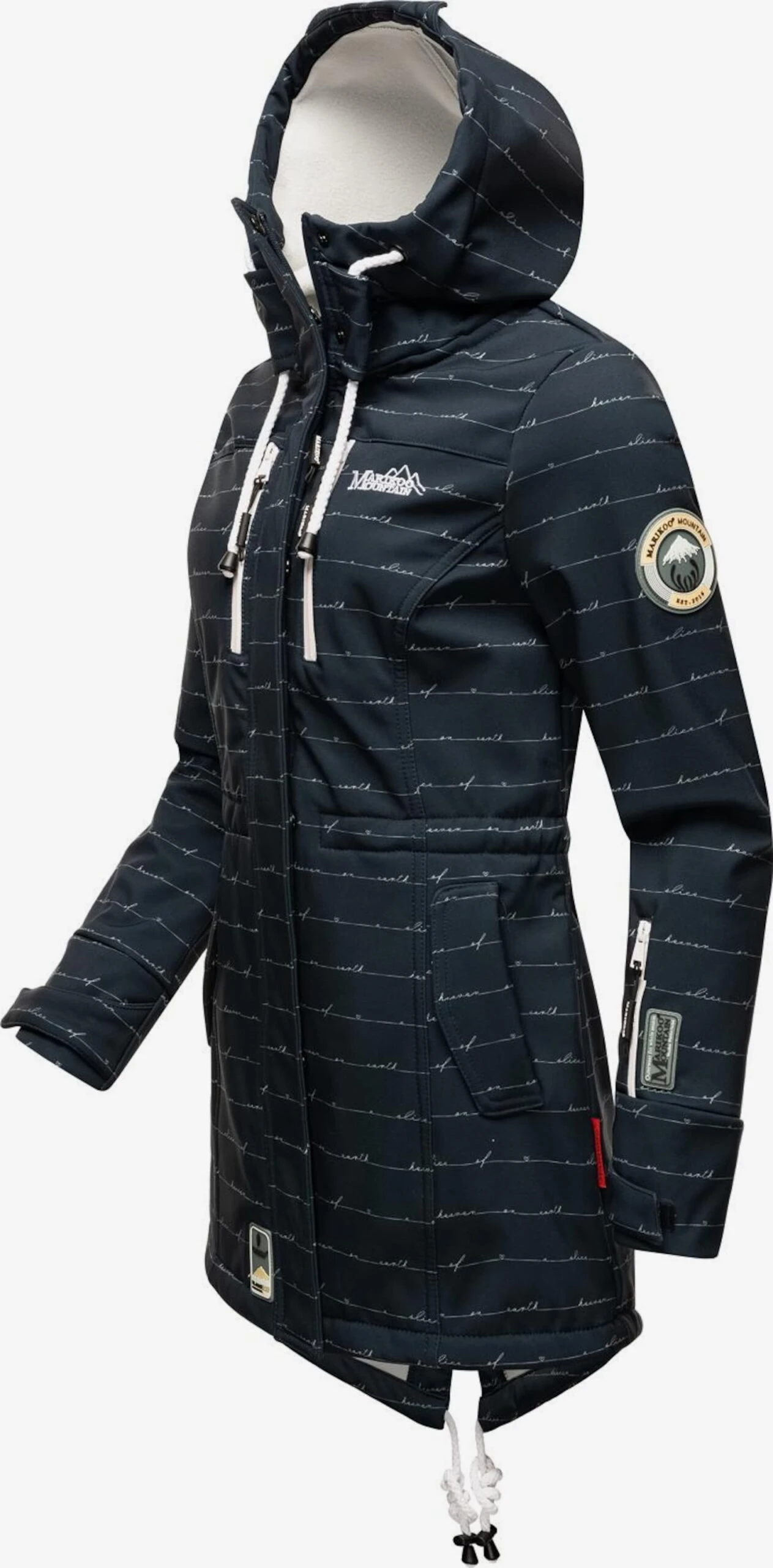 SoftshellRegenjasRitssluitingTaille met trekkoordCapuchon met opstaande kraagCapuchon met trekkoordGeribd ceintuurtjeGetailleerd modelVerlengd rugpandMouwzakBorstzakBinnenzakOpzet-/flapzakKlittenbandsluitingMateriaal mixFleece binnenvoeringTrekkoord in de boordLabel patch/label flagLabel borduurwerkOp staal nadenStevige stofWaterdichtGummiprintLicht gevoerdRitssluiting