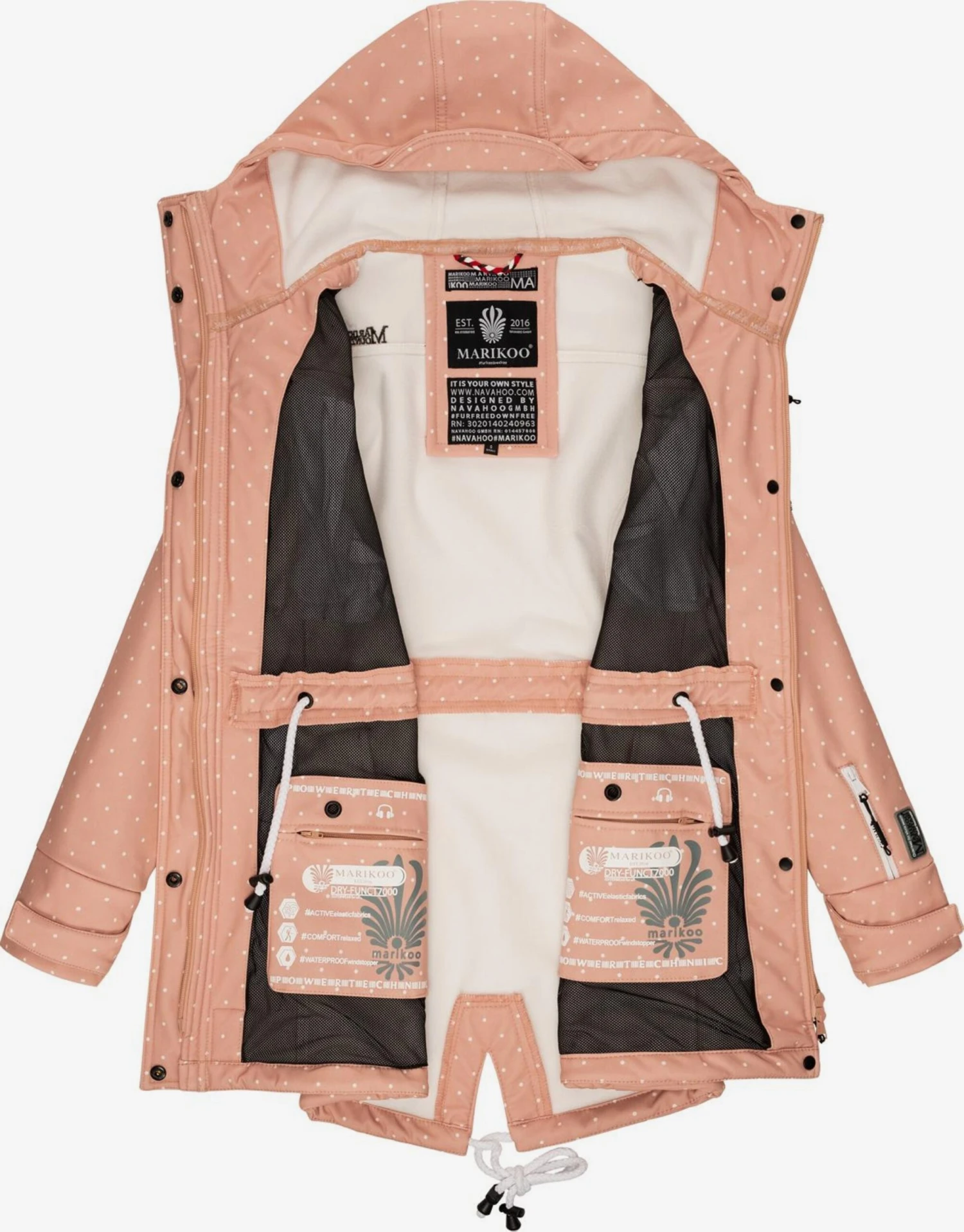 GestippeldSoftshellRegenjasRitssluitingCapuchon met trekkoordGeribd ceintuurtjeVerlengd rugpandMouwzakBorstzakBinnenzakOpzet-/flapzakKlittenbandsluitingFleece binnenvoeringTrekkoord in de boordLabel patch/label flagLabel borduurwerkOp staal nadenStevige stofLicht gevoerdRitssluiting