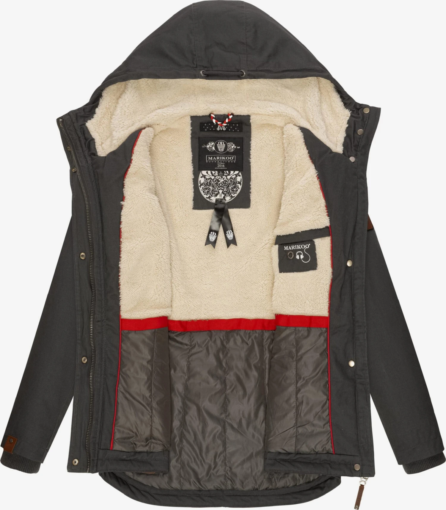 EffenKatoenDrukknopenCapuchon met trekkoordRonde zoomStaande kraagVerborgen ritsVerlengd rugpandBorstzakBinnenzakZakken aan de zijkantTeddy voeringLabel plaatjeOp staal nadenZware stofWarm gevoerdRitssluiting