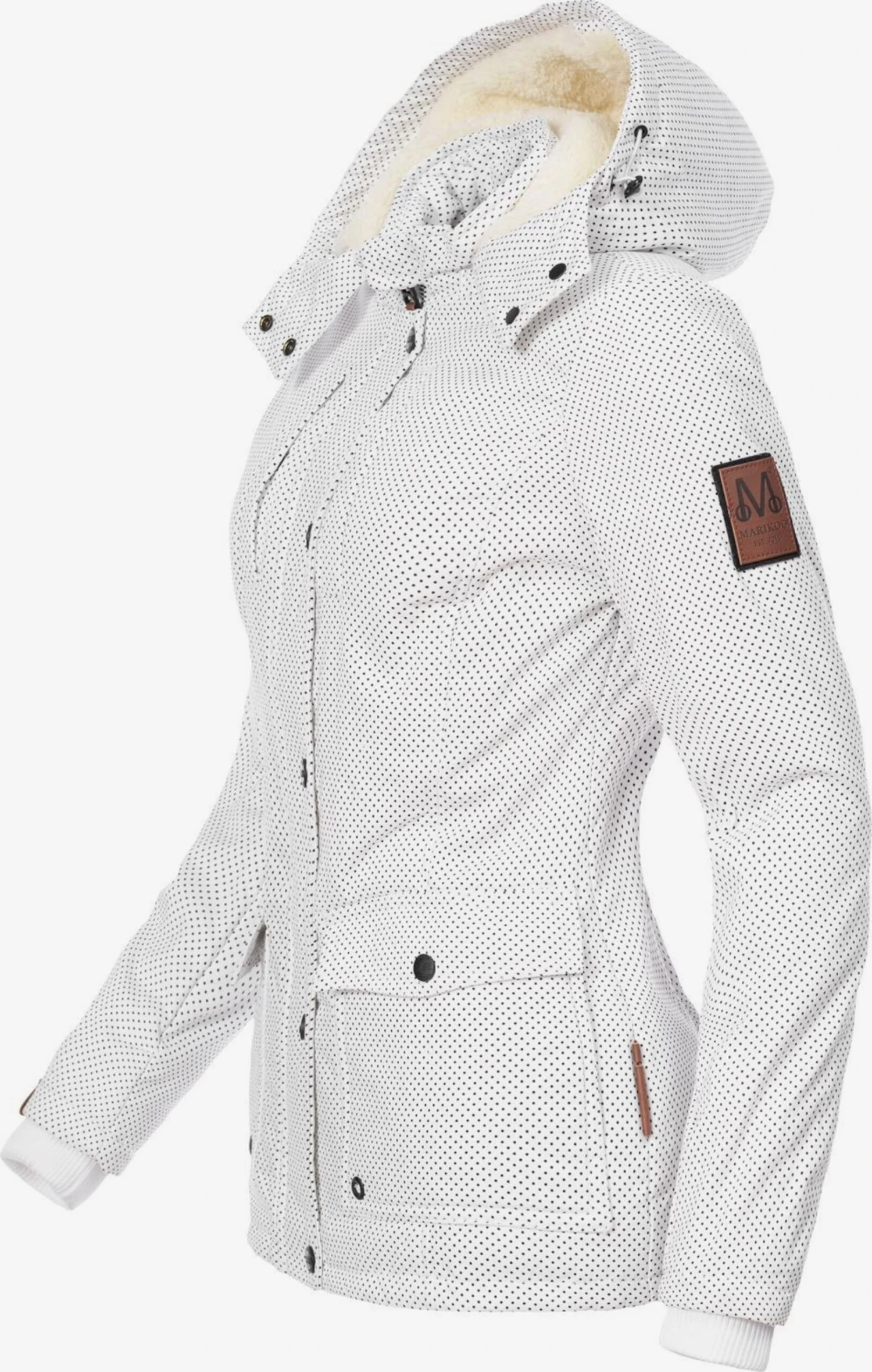 GestippeldKatoenRitssluitingAfneembare capuchonDrukknopenGeribd ceintuurtjeGetailleerd modelBorstzakBinnenzakOpzet-/flapzakTeddy voeringLabel patch/label flagWarm gevoerdRitssluiting